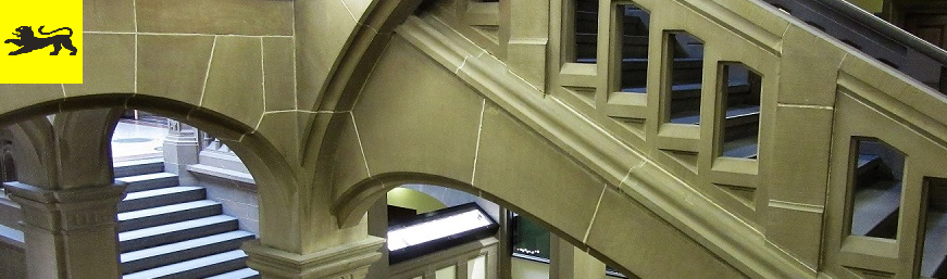 Zwischenpodestes der Haupttreppe zwischen dem Erdgeschoss und dem 1. Stock sind die Tagesordnungen ausgehängt.